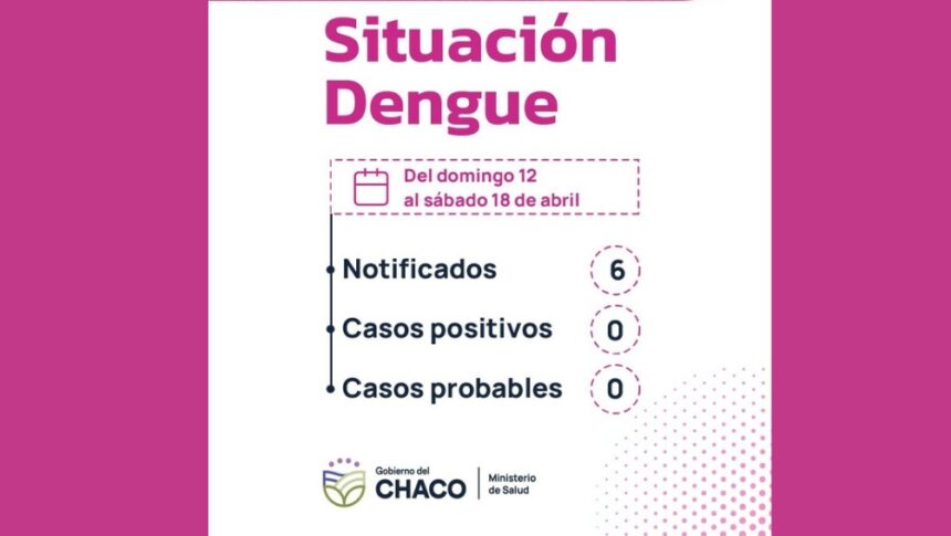 El Ministerio de Salud de la Provincia del Chaco informó que, durante la semana comprendida entre el domingo 12 y el sábado 18 de abril, no se registraron casos positivos ni probables de Dengue en todo el territorio provincial.